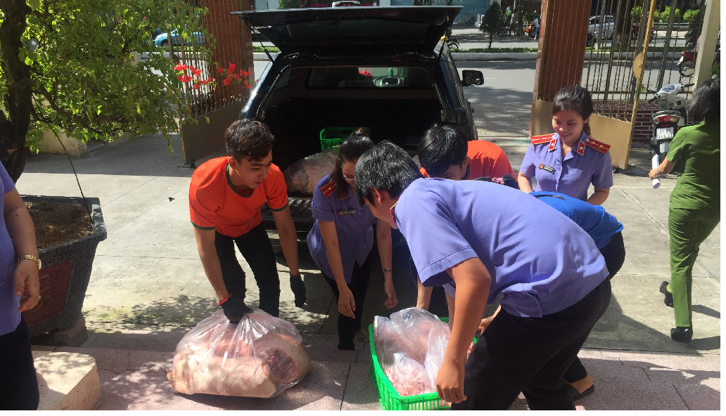 Thịt lợn được phân chia ra để chia sẽ đến các cán bộ, công chức và người lao động trong cơ quan.