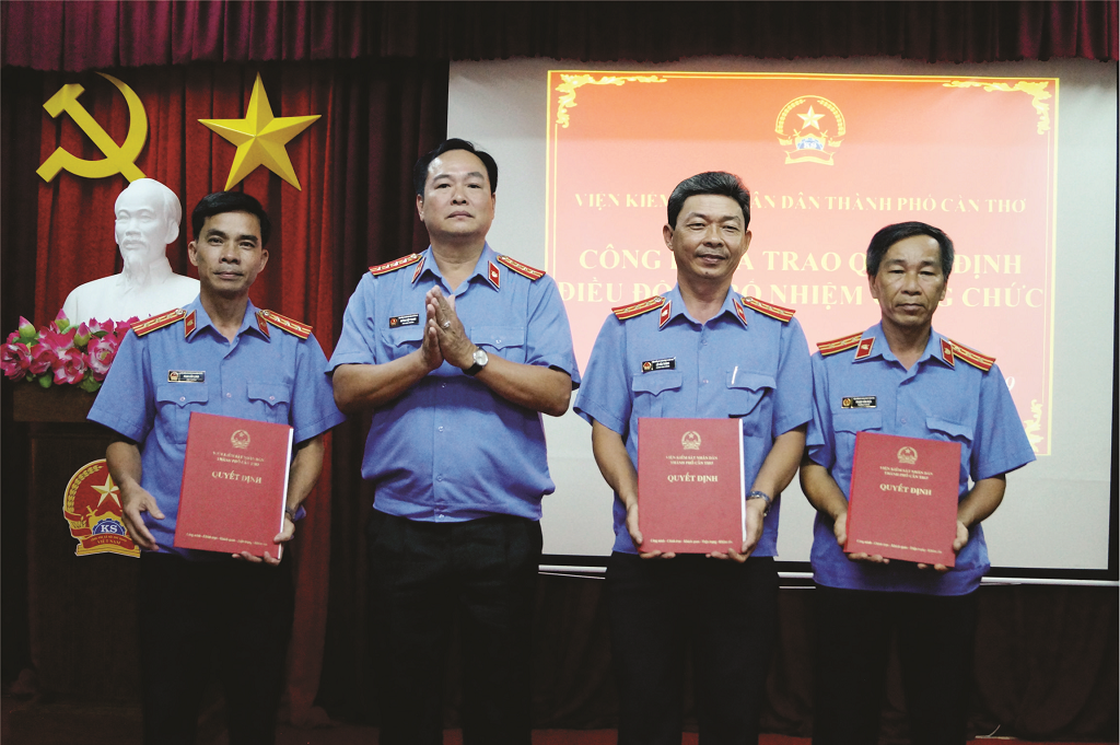 Tại buổi công bố, đồng chí Đỗ Công Tâm - Trưởng phòng Tổ chức cán bộ, công bố các Quyết định của Viện trưởng Viện kiểm sát nhân dân thành phố Cần Thơ gồm: Quyết định số 08/QĐ-VKSTC ngày 20/5/2019 điều động và bổ nhiệm ông Phan Hữu Long, Kiểm sát viên trung cấp, Viện trưởng Viện kiểm sát nhân dân huyện Cờ Đỏ, đến nhận công tác tại Viện kiểm sát nhân dân thành phố Cần Thơ, giữ chức vụ Chánh Văn phòng; Quyết định số 09/QĐ-VKSTC ngày 20/5/2019 điều động ông Phạm Văn Dựa, Kiểm sát viên trung cấp, Trưởng phòng thực hành quyền công tố, kiểm sát xét xử phúc thẩm án hình sự đến nhận công tác tại Phòng thực hành quyền công tố, kiểm sát điều tra, kiểm sát xét xử sơ thẩm án hình sự về kinh tế - chức vụ, giữ chức vụ Trưởng phòng; Quyết định số 10/QĐ-VKSTC ngày 20/5/2019 điều động ông Lê Hữu Thành, Kiểm sát viên trung cấp, Chánh Văn phòng tổng hợp đến nhận công tác tại Phòng thực hành quyền công tố, kiểm sát xét xử phúc thẩm án hình sự, giữ chức vụ Trưởng phòng. Các quyết định có hiệu lực kể từ ngày 01/6/2019.