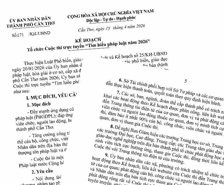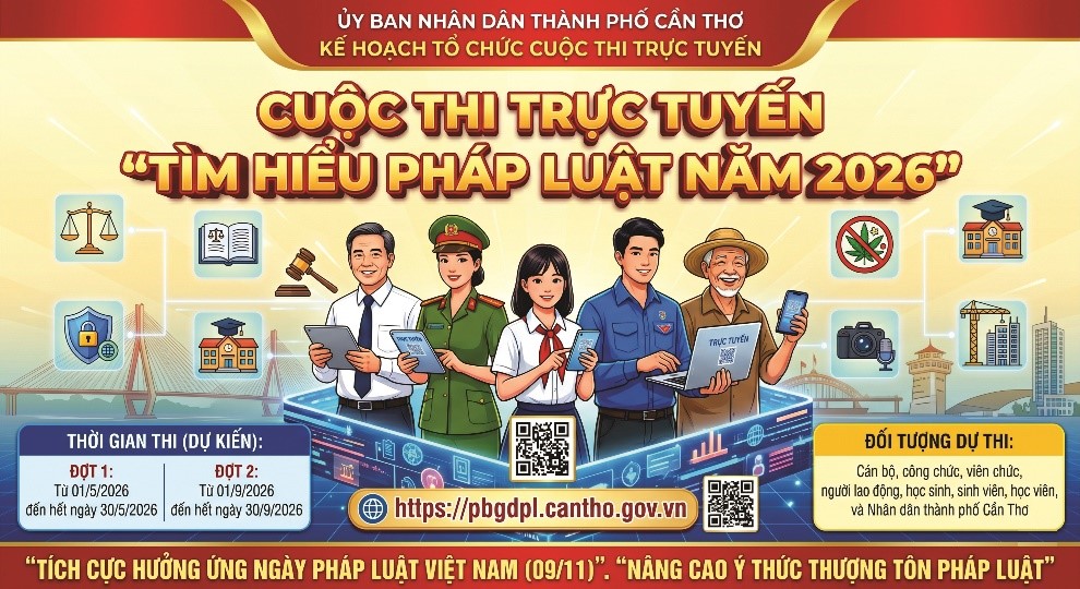 Nhằm đẩy mạnh ứng dụng công nghệ thông tin trong công tác phổ biến, giáo dục pháp luật, Ủy ban nhân dân thành phố Cần Thơ vừa ban hành Kế hoạch số 171/KH-UBND về tổ chức Cuộc thi trực tuyến “Tìm hiểu pháp luật năm 2026”.