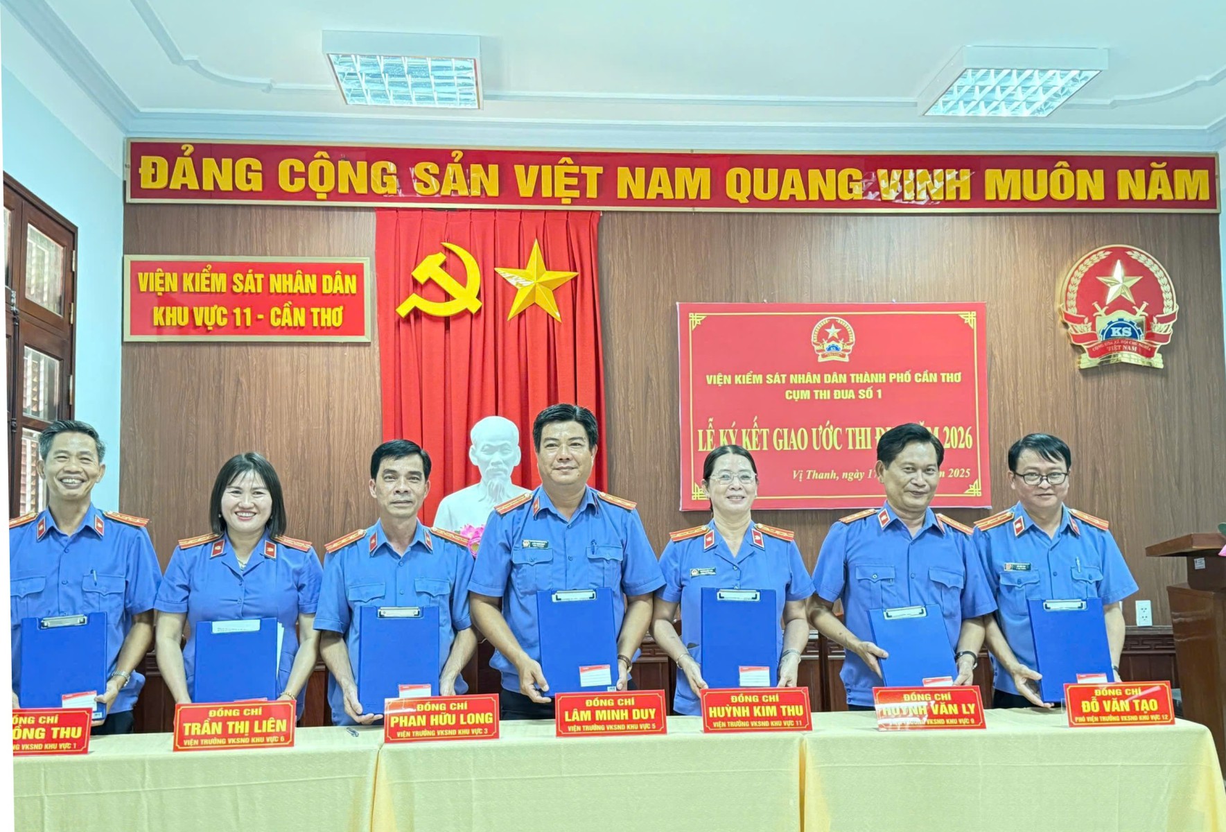 Thực hiện kế hoạch số 06/KH-VKS ngày 28/10/2025 của Viện kiểm sát nhân dân thành phố Cần Thơ về phát động phong trào thi đua yêu nước năm 2026 và Kế hoạch số 03/KH-CTĐ ngày 15/12/2025 của Cụm thi đua số 1 Viện kiểm sát nhân dân thành phố Cần Thơ về việc tổ chức các hoạt động năm 2026 của Cụm thi đua số 1. Vừa qua, tại Viện kiểm sát nhân dân (VKSND) Khu vực 11 - Cần Thơ đã tổ chức Lễ ký kết Giao ước thi đua của Cụm thi đua số 1 năm 2026.