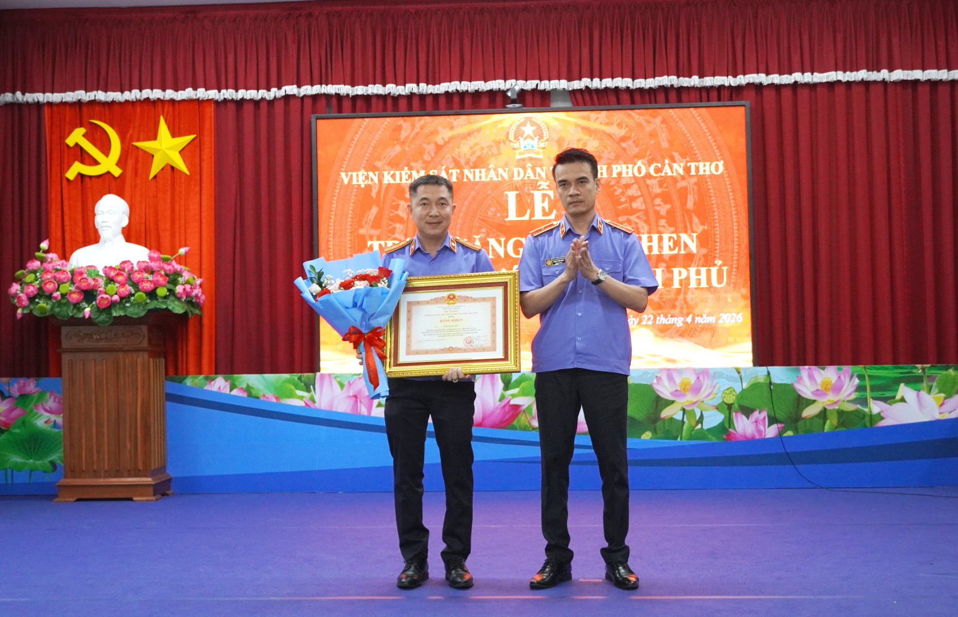 Đồng chí Phạm Xuân Minh, Viện trưởng VKSND thành phố Cần Thơ trao Bằng khen của Thủ tướng Chính phủ cho đồng chí Phạm Hoài Hận, Phó Viện trưởng VKSND Khu vực 3