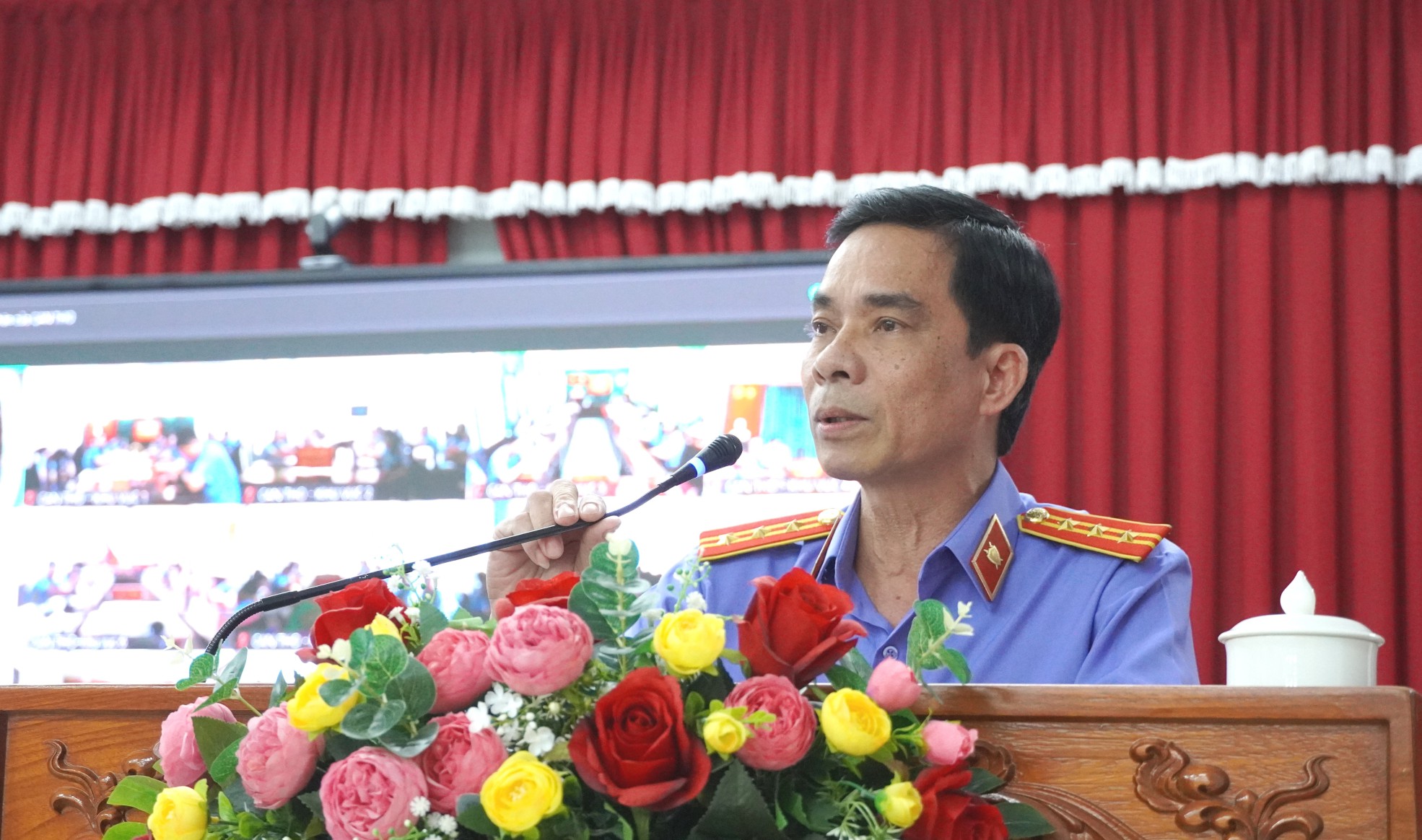 Đồng chí Lê Văn Meo, Viện trưởng VKSND Khu vực 12 phát biểu tham luận tại Hội nghị