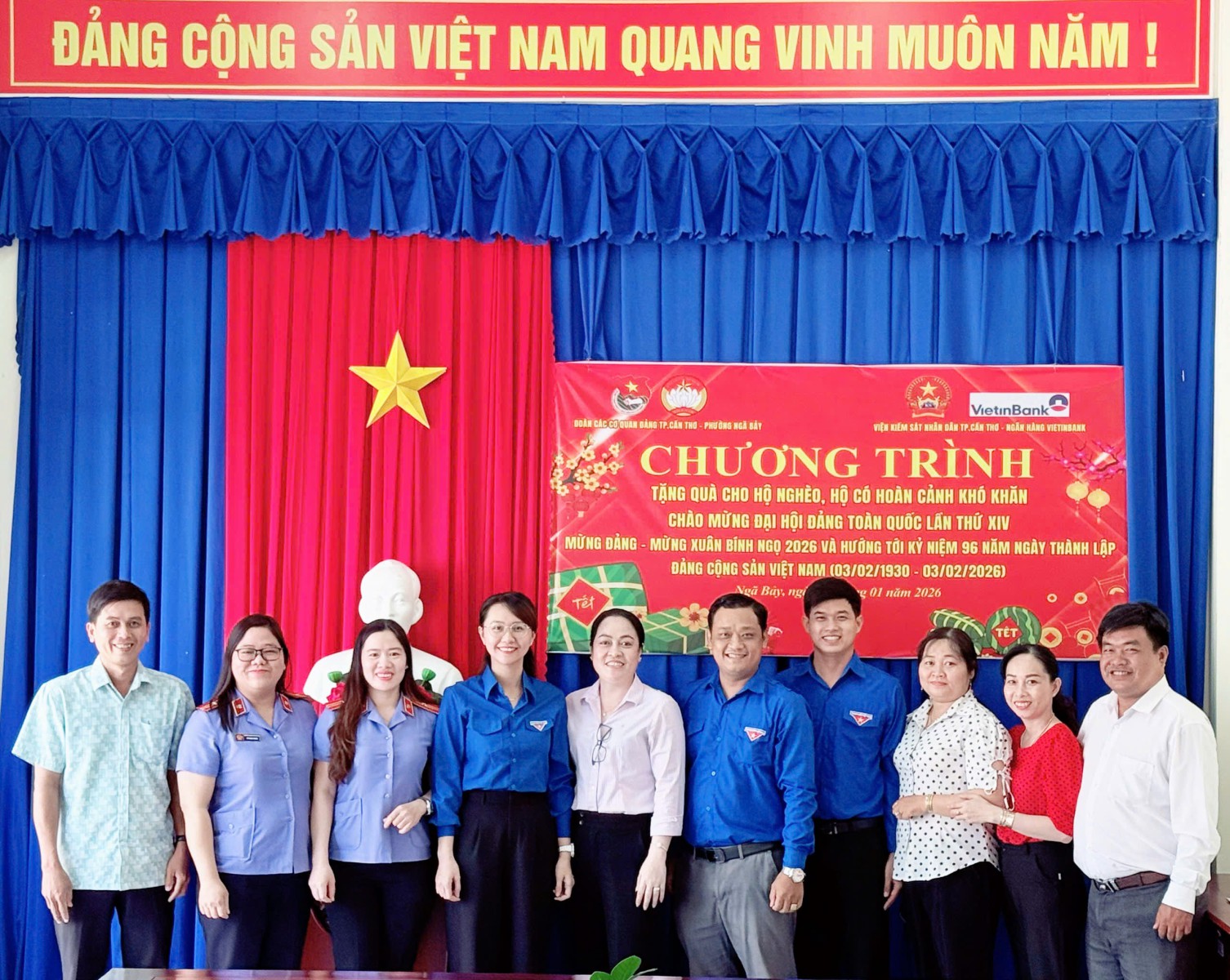 Thiết thực chào mừng Đại hội Đảng toàn quốc lần thứ XIV, mừng Đảng - mừng Xuân Bính Ngọ năm 2026 và hướng tới kỷ niệm 96 năm Ngày thành lập Đảng Cộng sản Việt Nam (03/02/1930 - 03/02/2026), ngày 23/01/2026, Đoàn cơ sở VKSND thành phố Cần Thơ tham mưu cho Đoàn các cơ quan Đảng thành phố Cần Thơ phối hợp với Đoàn phường Ngã Bảy, thành phố Cần Thơ tổ chức chương trình tặng quà cho các hộ nghèo, hộ có hoàn cảnh khó khăn trên địa bàn phường Ngã Bảy.
