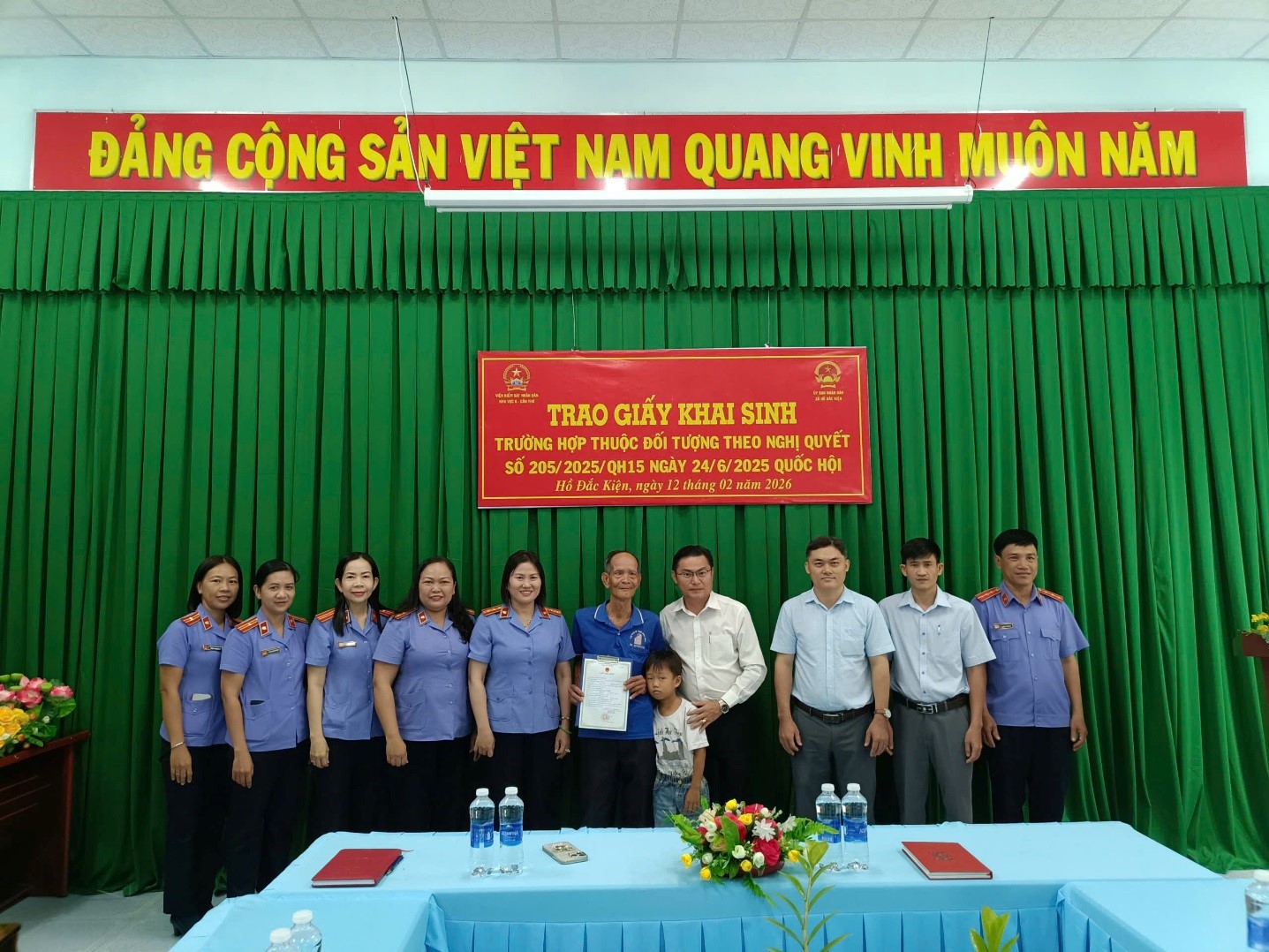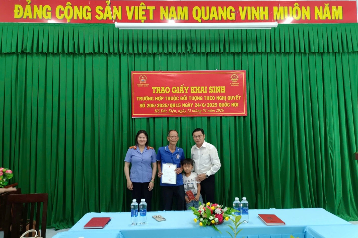 Buổi trao giấy khai sinh được tổ chức trang trọng tại trụ sở UBND xã Hồ Đắc K, với sự tham dự của các đồng chí Trần Thị Liên, Viện trưởng VKSND Khu vực 6; đồng chí Nguyễn Văn Mỹ và ông Mai Văn H cùng cháu Mai Văn Thiện E. Hoạt động trên đã thể hiện sự phối hợp tích cực giữa cơ quan hành chính nhà nước và Viện kiểm sát trong việc bảo vệ quyền con người, quyền công dân, đặc biệt là quyền được khai sinh của trẻ em theo quy định của pháp luật. Kết quả này khẳng định hiệu quả bước đầu của việc triển khai thí điểm Nghị quyết số 205/2025/QH15, góp phần bảo đảm quyền dân sự của nhóm người yếu thế trên địa bàn.