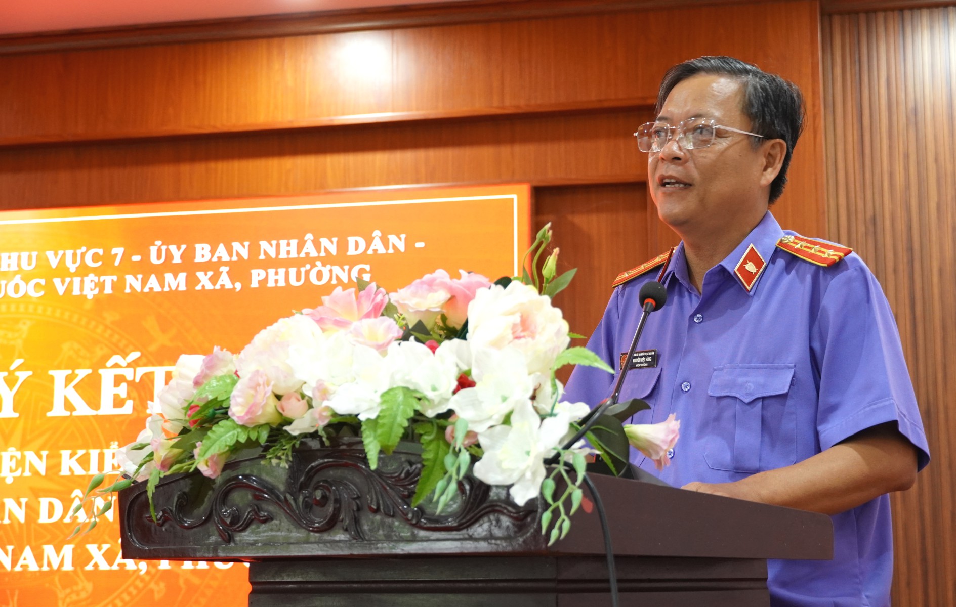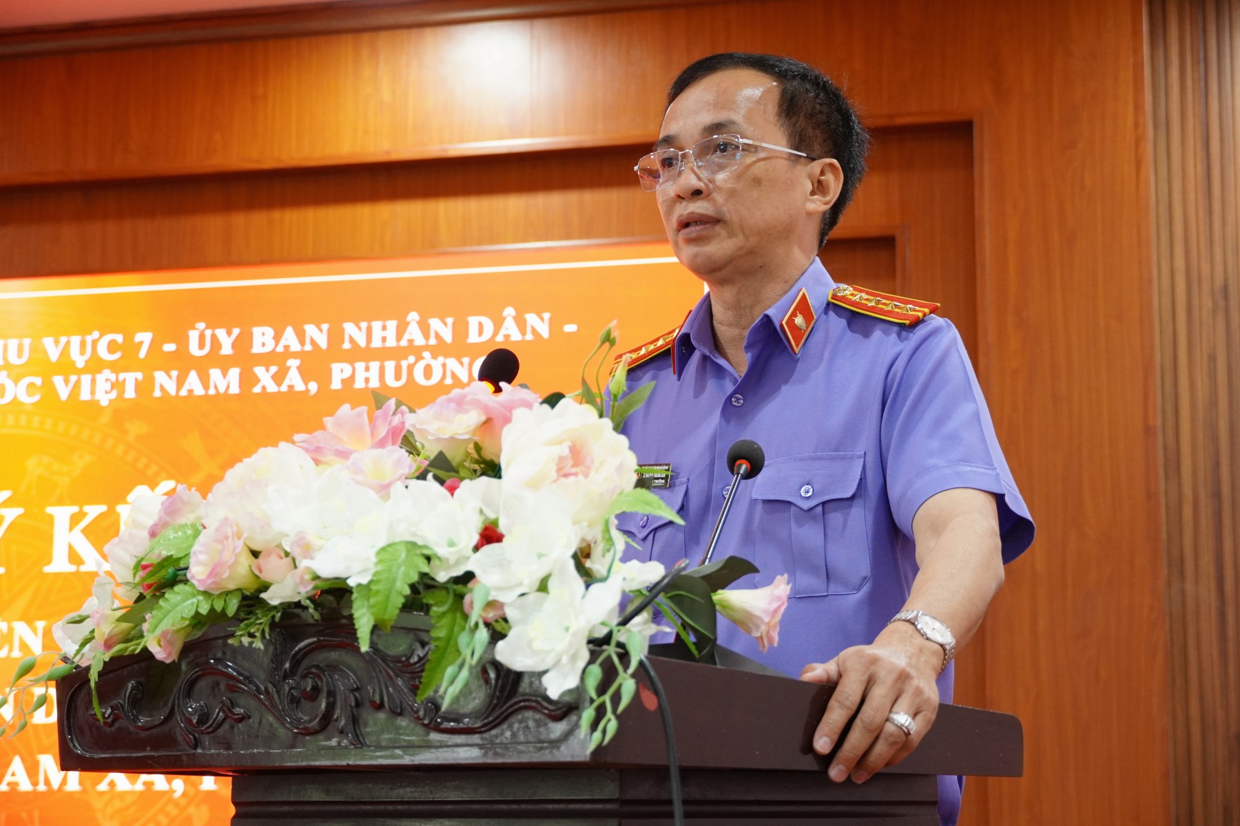 Đồng thời đồng chí Lê Nguyễn Trường Sơn, Phó Bí thư Đảng ủy, Phó Viện trưởng VKSND thành phố Cần Thơ thay mặt đơn vị cảm ơn sự quan tâm phối hợp của Đảng ủy, UBND, UB MTTQ Việt Nam trong việc khởi kiện dân sự đối với nhóm dễ bị tổn thương hoặc lợi ích công đây cũng là lĩnh vực mới của VKS, để làm được vấn đề này cần có sự phối hợp của địa phương.