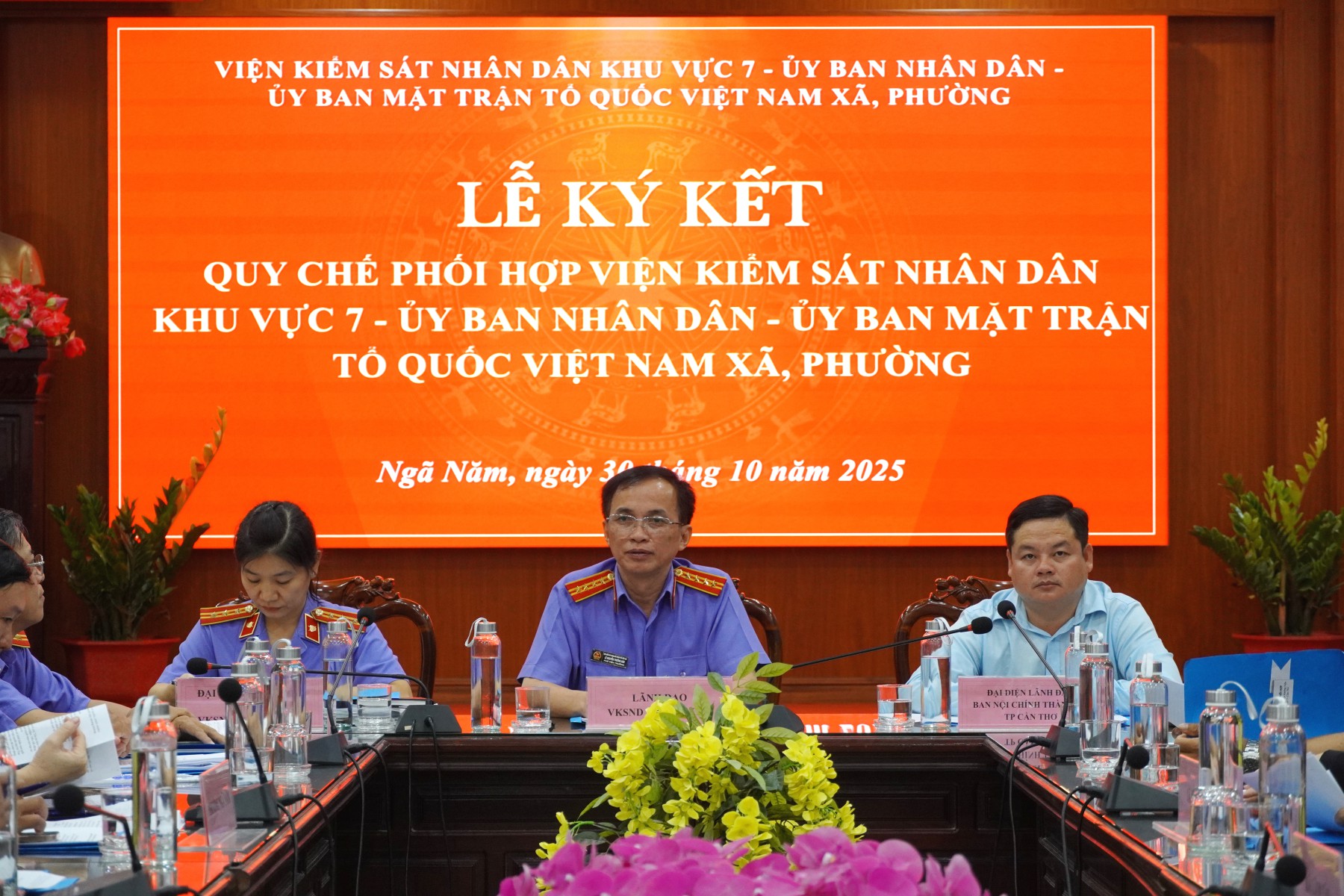 Chiều ngày 30/10/2025, Viện kiểm sát nhân dân (VKSND) Khu vực 7- Cần Thơ đã tổ chức buổi lễ ký kết Quy chế phối hợp với 6 xã, phường của thành phố Cần Thơ trong việc khởi kiện hành vi xâm phạm quyền dân sự của các chủ thể là nhóm dễ bị tổn thương hoặc bảo vệ lợi ích công.