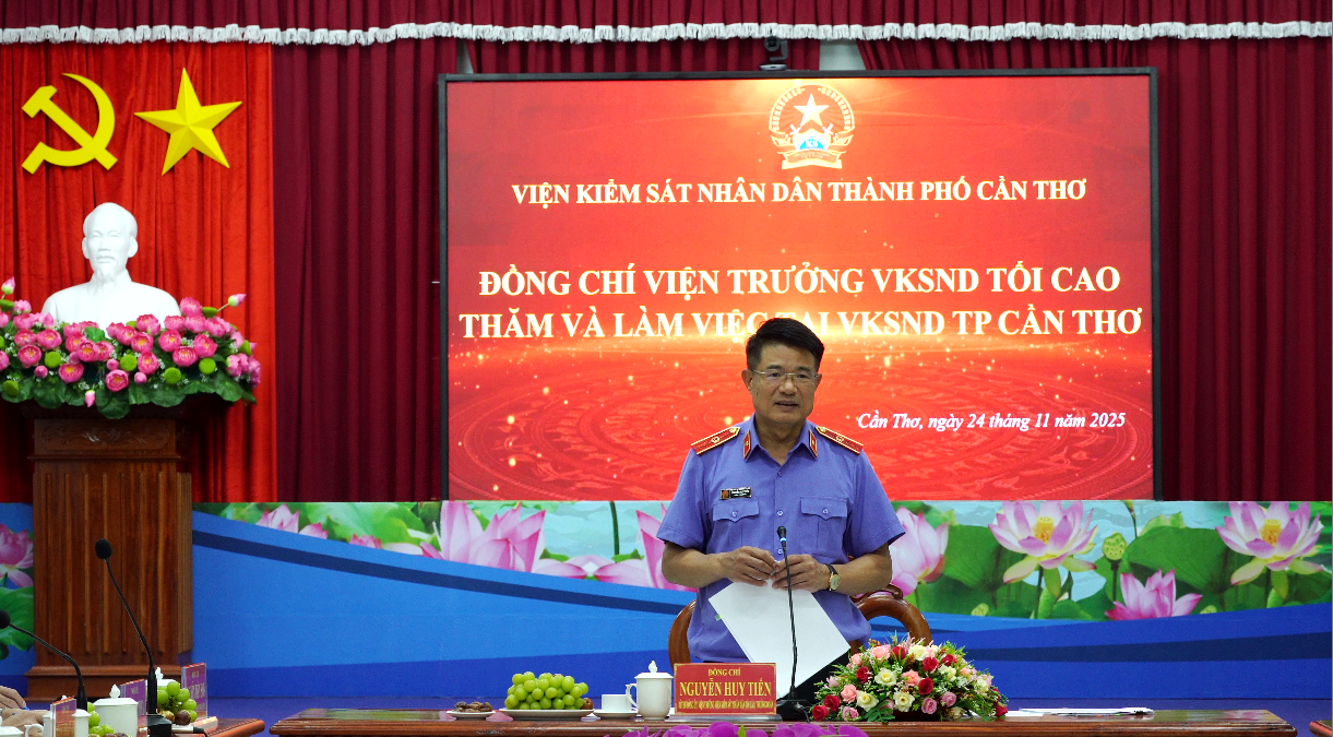Phát biểu chỉ đạo tại buổi làm việc, đồng chí Nguyễn Huy Tiến, Bí thư Đảng ủy, Viện trưởng VKSND tối cao, ghi nhận và đánh giá cao những nỗ lực, khắc phục khó khăn của VKSND hai cấp thành phố Cần Thơ để hoàn thành nhiệm vụ được giao trong năm 2025.