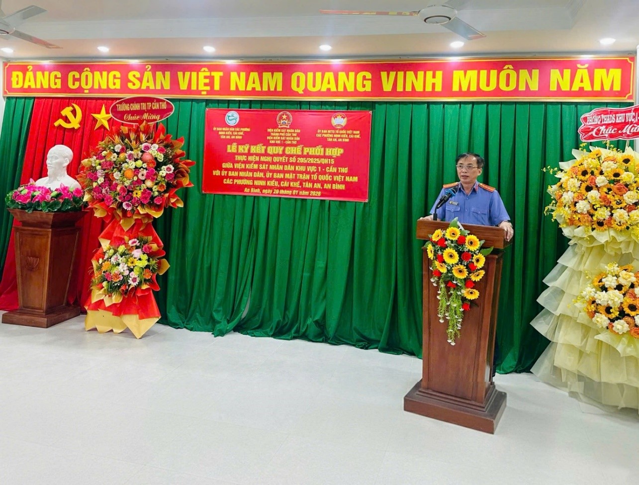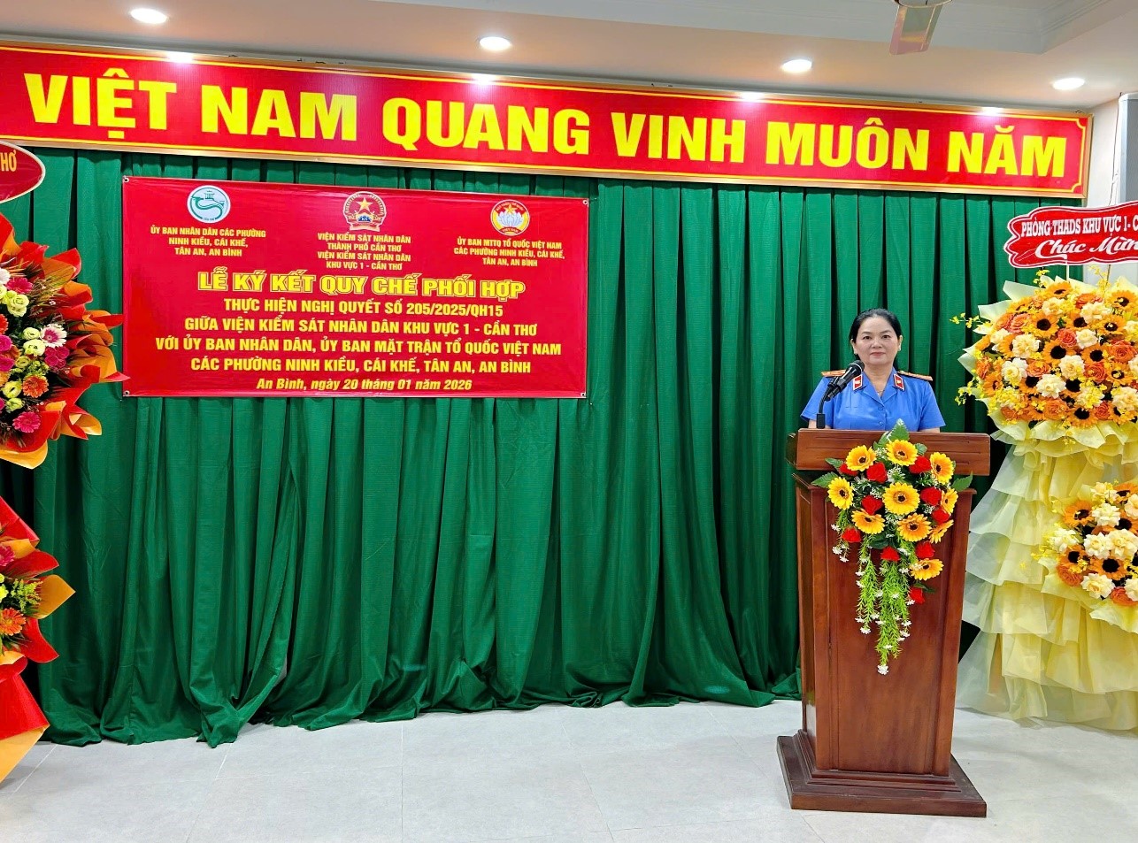 Ngày 20 tháng 01 năm 2026, VKSND Khu vực 1- Cần Thơ (VKSND Khu vực 1) đã tổ chức Lễ ký kết Quy chế phối hợp thực hiện thí điểm Nghị quyết 205/2025/QH15 với Ủy ban nhân dân và Ủy ban Mặt trận Tổ quốc Việt Nam của các phường Ninh Kiều, Cái Khế, Tân An và An Bình.