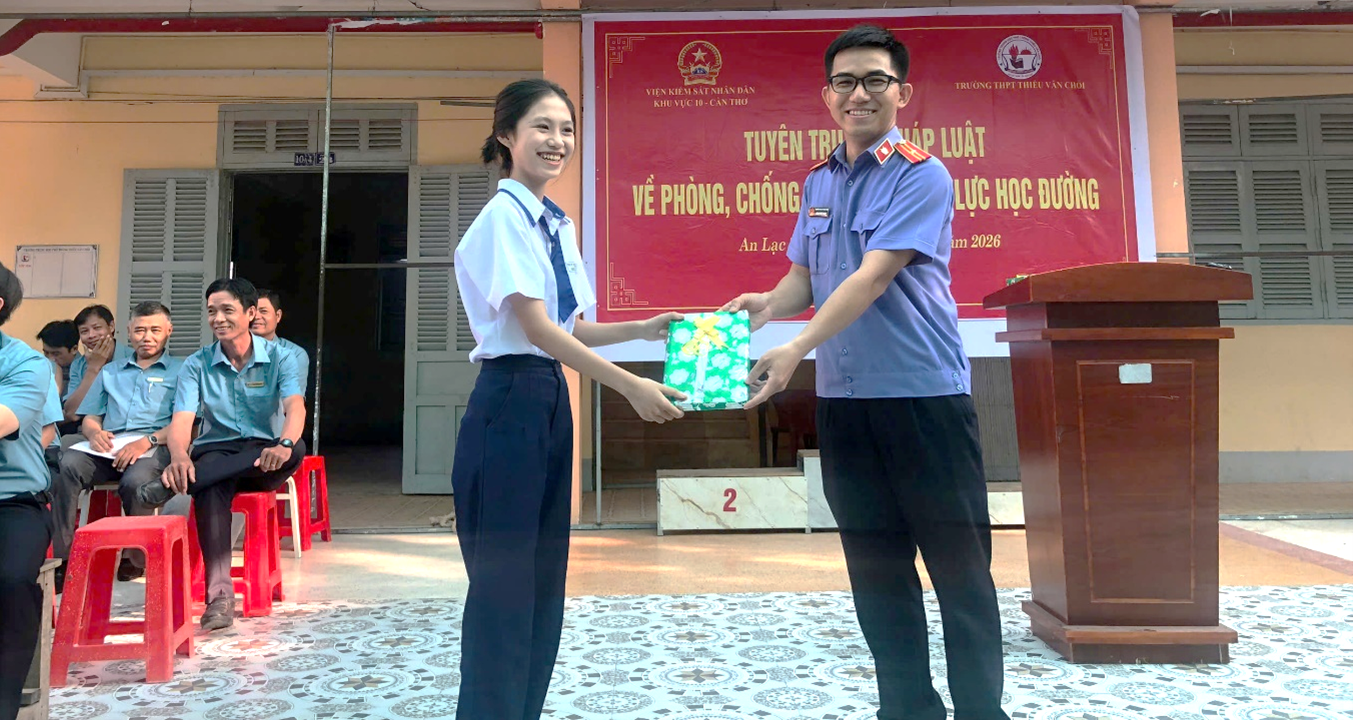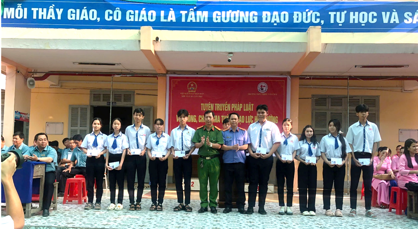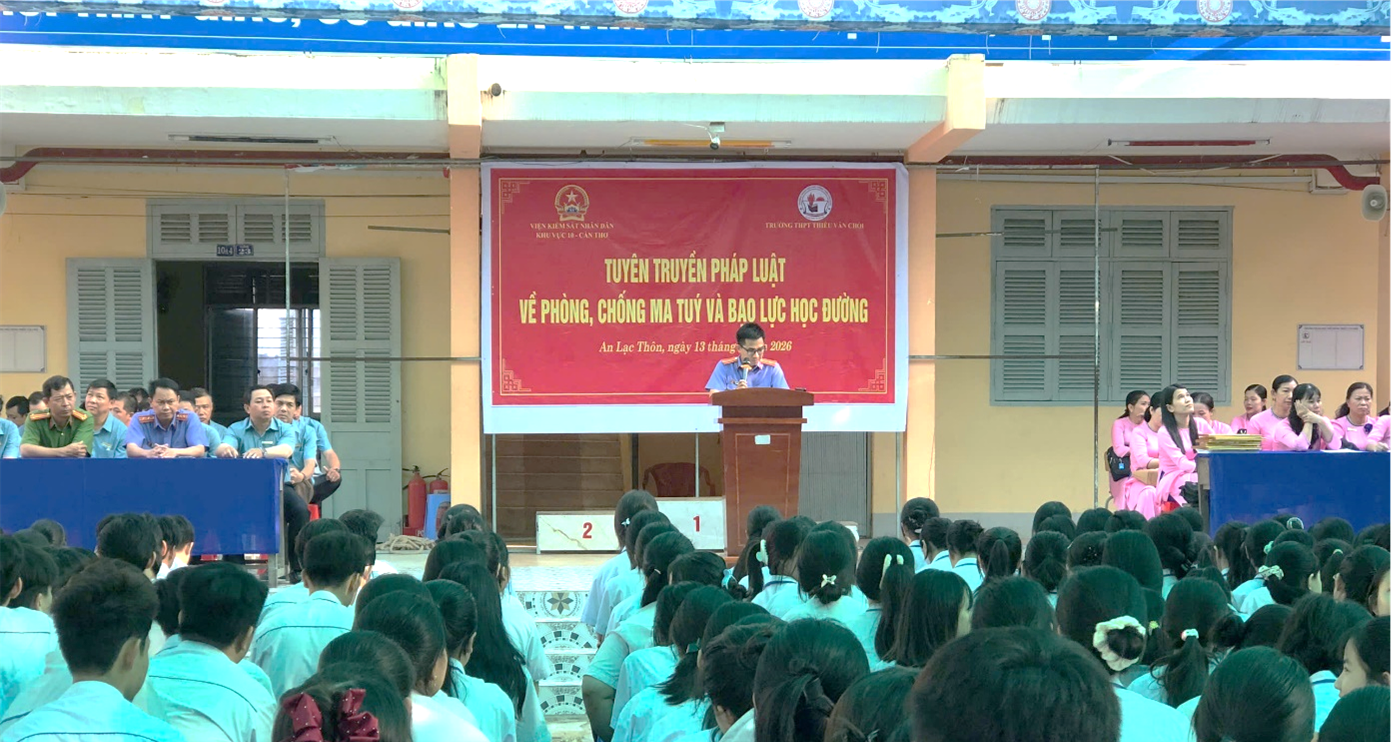 Thực hiện Kế hoạch số 279/KH-VKS-KV10 ngày 24/3/2026 tổ chức tuyên truyền pháp luật về phòng, chống ma tuý và bạo lực học đường. Sáng ngày 13/4/2026, Viện kiểm sát nhân dân Khu vực 10 - Cần Thơ (VKSND Khu vực 10) đã phối hợp cùng Công an xã An Lạc Thôn và Ban Giám hiệu Trường Trung học phổ thông Thiều Văn Chỏi tổ chức tuyên truyền pháp luật về phòng, chống ma tuý và bạo lực học đường cho toàn thể học sinh nhà trường.