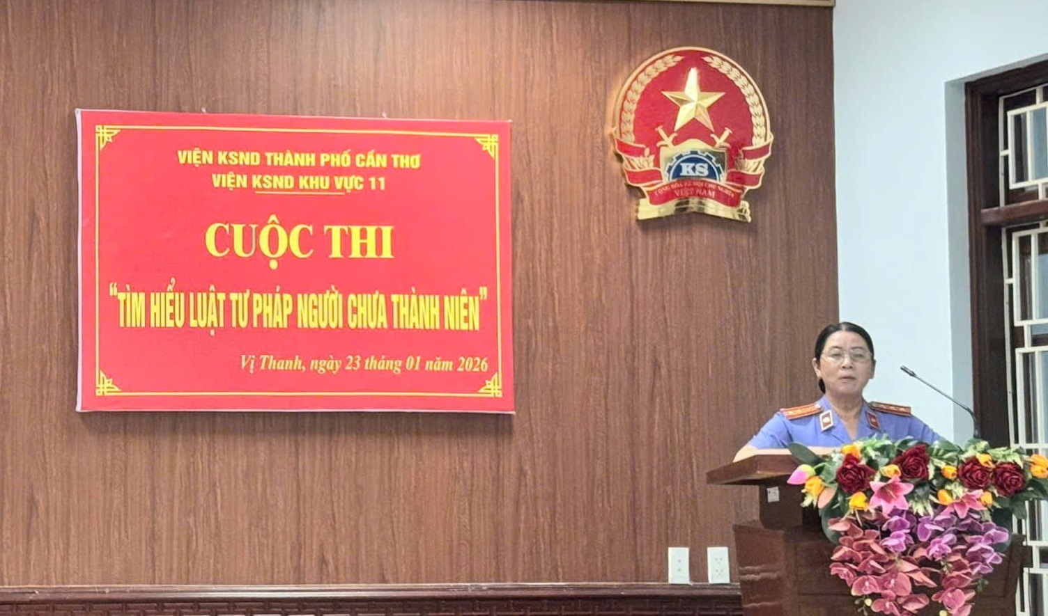 Đồng chí Huỳnh Kim Thu, Viện trưởng VKSND Khu vực 11 - Cần Thơ, Trưởng Ban Tổ chức phát biểu khai mạc cuộc thi