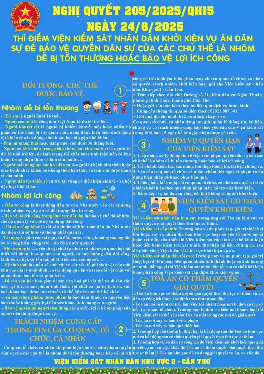 Thực hiện chỉ đạo của VKSND tối cao và VKSND thành phố Cần Thơ, VKSND Khu vực 2 đã ban hành Kế hoạch số 05/KH-VKS ngày 11/11/2025, triển khai tuyên truyền Nghị quyết 205/2025/QH15 tại 06 phường trên địa bàn gồm: Bình Thủy, Long Tuyền, Thới An Đông, Ô Môn, Phước Thới và Thới Long. Đây là bước đi chủ động, thể hiện tinh thần trách nhiệm của đơn vị trong việc đưa chủ trương mới của Đảng và Nhà nước nhanh chóng đến với người dân.