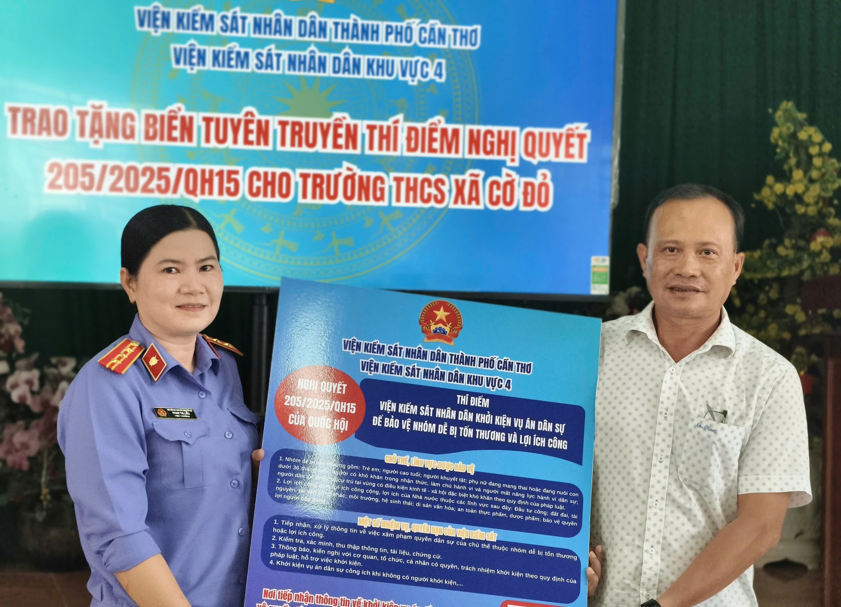 Tại chương trình, VKSND Khu vực 4 đã trao tặng biển tuyên truyền Nghị quyết 205/2025/QH15 cho Trường THCS thị trấn Cờ Đỏ nhằm hỗ trợ công tác phổ biến pháp luật lâu dài tại cơ sở.