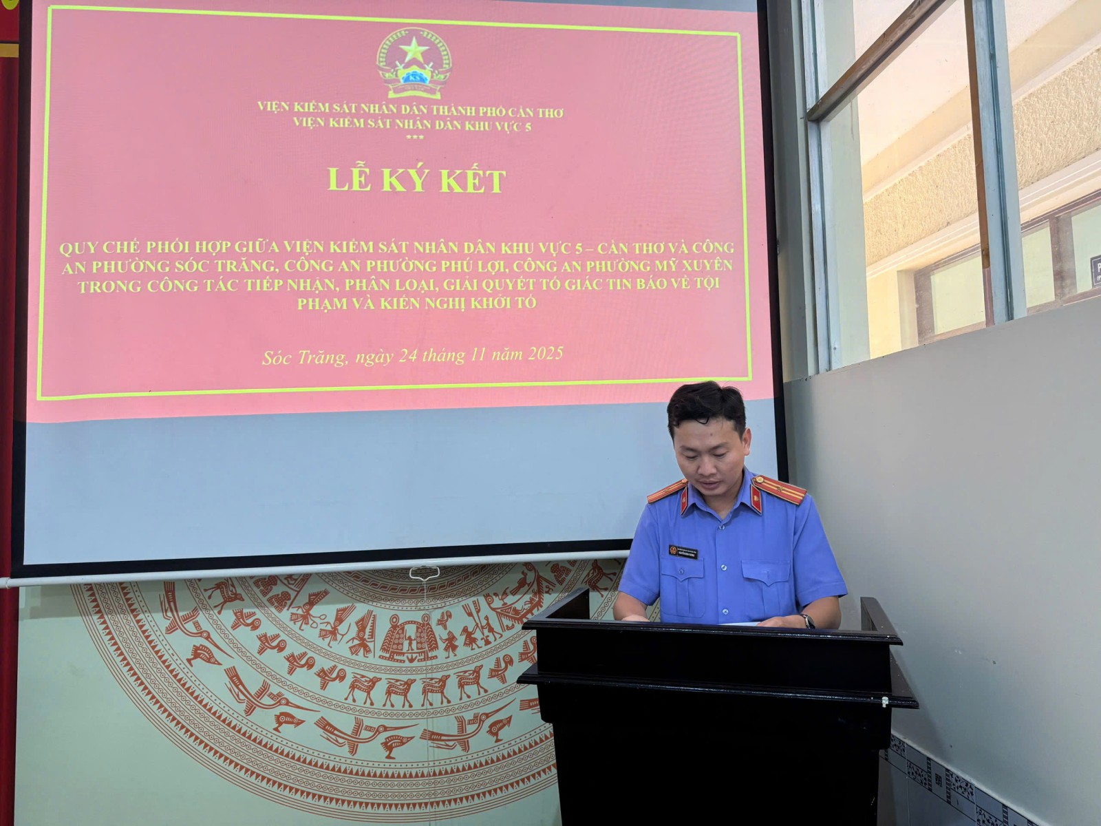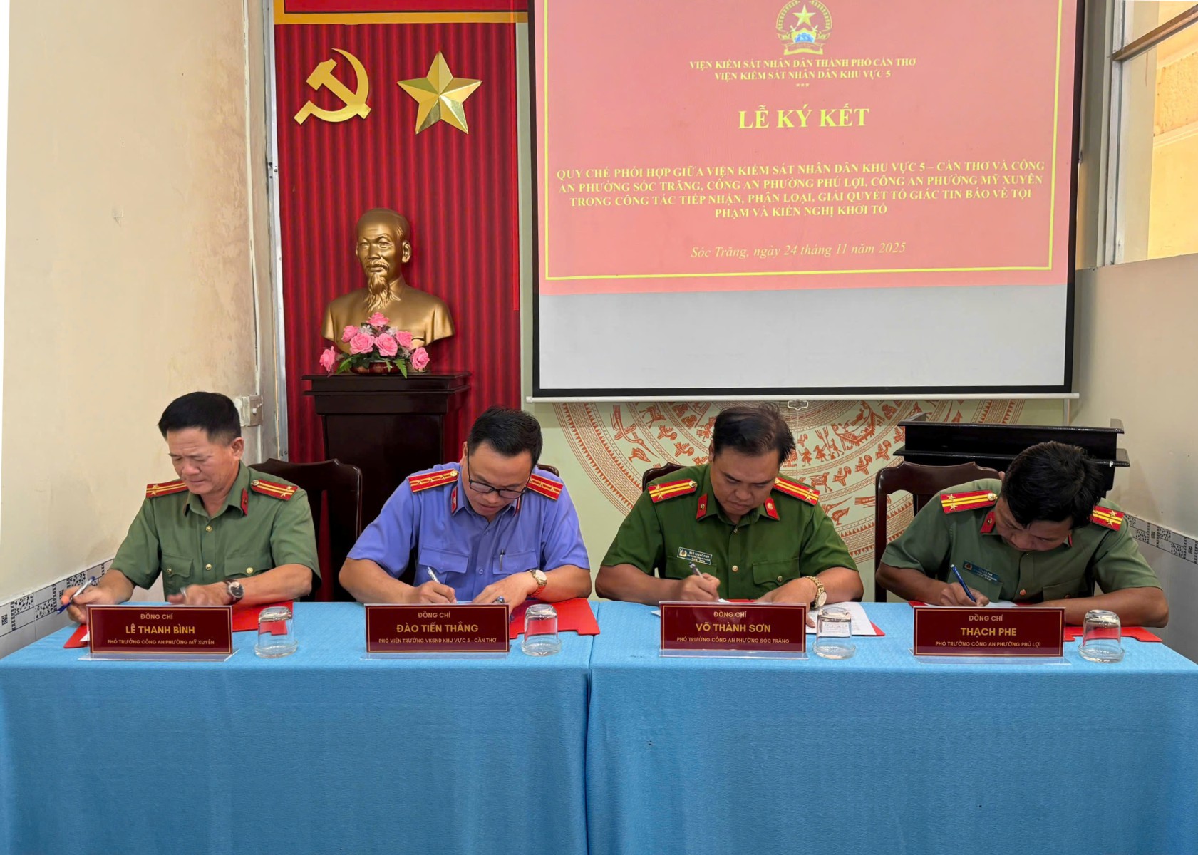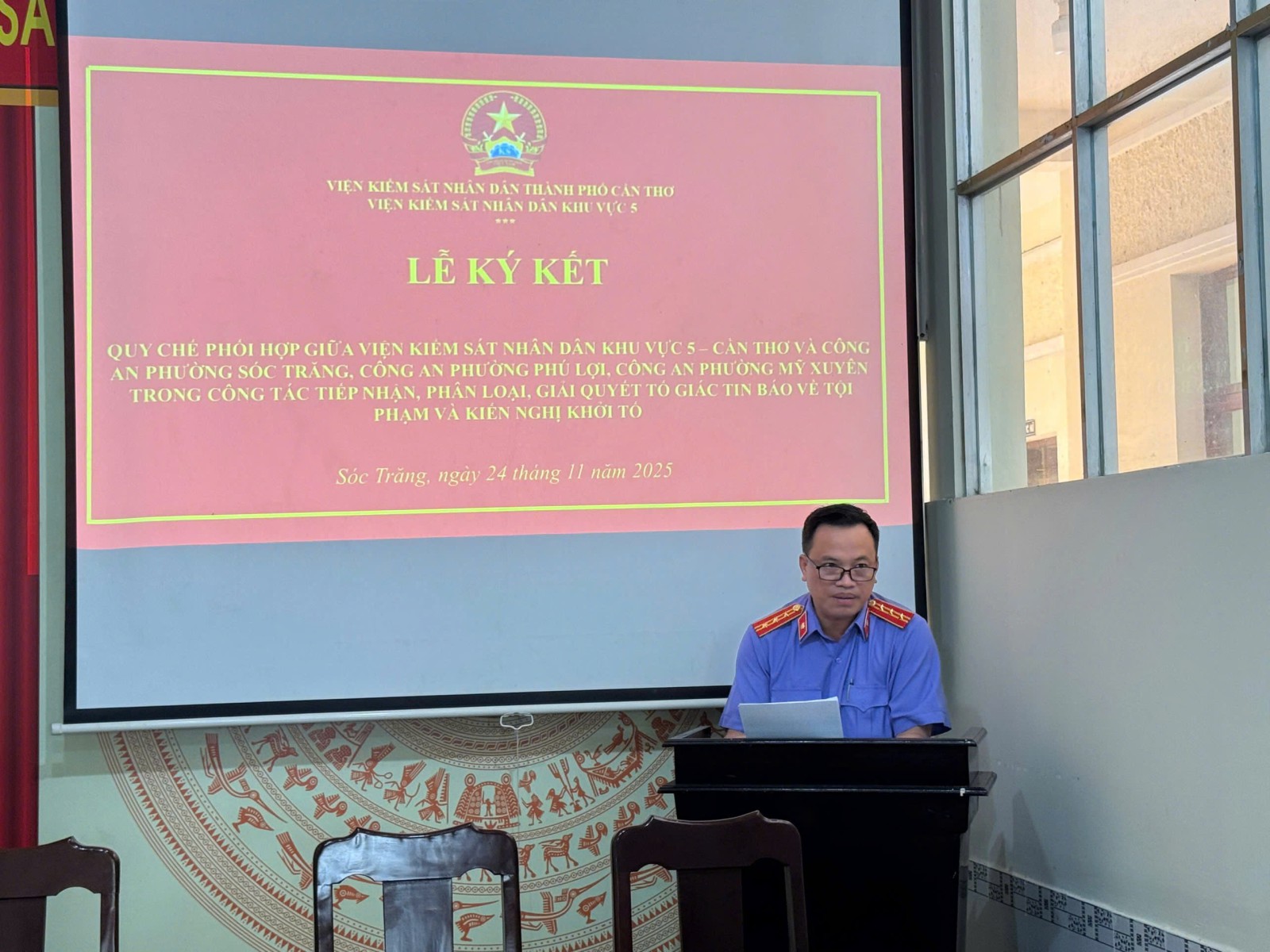 Chiều ngày 24/11/2025, tại hội trường cơ quan, VKSND Khu vực 5 - Cần Thơ chủ trì Lễ ký Quy chế phối hợp với 03 đơn vị Công an cấp xã trong công tác tiếp nhận, phân loại, giải quyết nguồn tin về tội phạm.