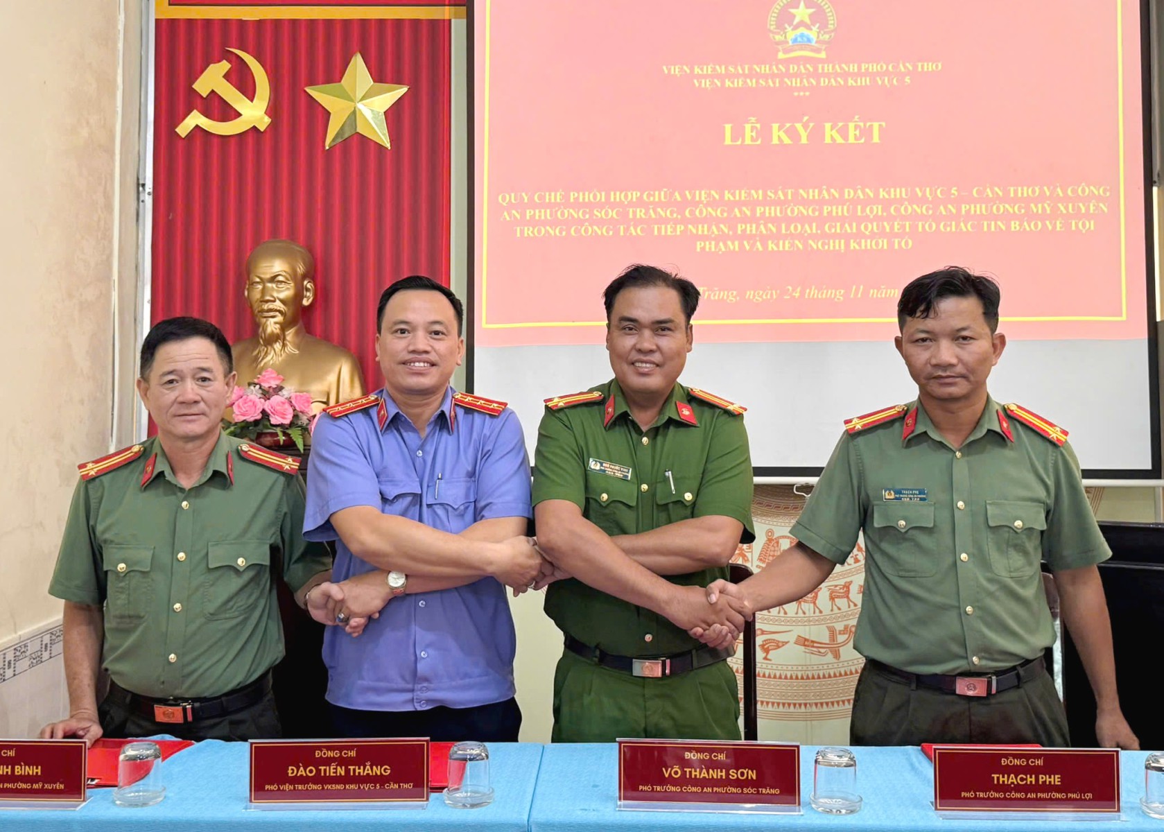 Tham dự lễ ký kết có các đồng chí: Đào Tiến Thắng, Phó Viện trưởng VKSND Khu vực 5 - Cần Thơ; Nguyễn Thành Quang, Phó Viện trưởng VKSND Khu vực 5 - Cần Thơ; Ngô Phước Vinh, Phó Trưởng Công an phường Sóc Trăng; Thạch Phe, Phó Trưởng Công an phường Phú Lợi; Lê Thanh Bình, Phó Trưởng Công an phường Mỹ Xuyên cùng các đồng chí Điều tra viên của 03 đơn vị Công an cấp xã và các Kiểm sát viên, Chuyên viên của đơn vị.