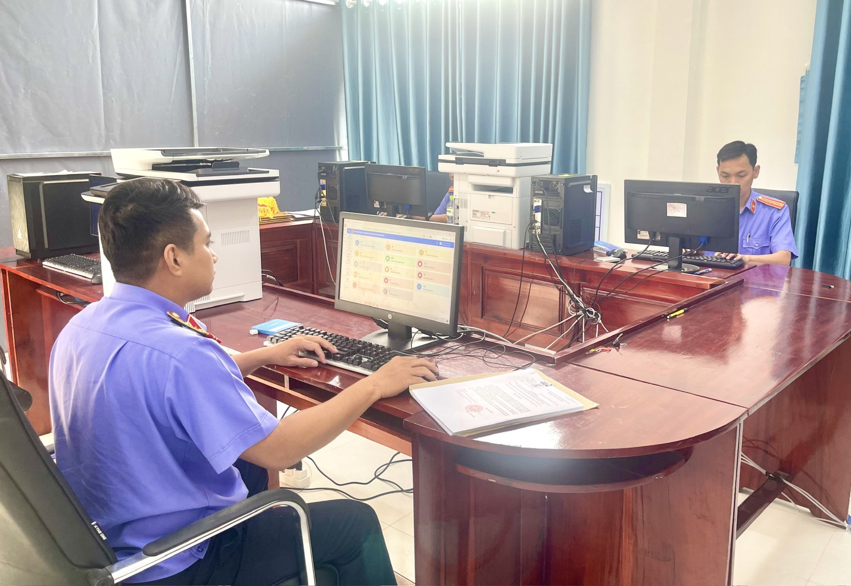 Đ/c Trầm Minh Khang, Phó Viện trưởng VKSND Khu vực 8 theo dõi thông tin, số liệu nhập án trên phần mềm