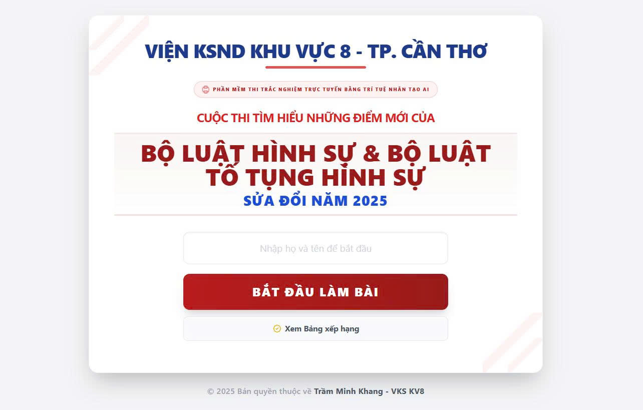 Cuộc thi nhận được sự hưởng ứng rất tích cực từ Lãnh đạo, Kiểm sát viên và toàn thể công chức trong đơn vị. Cuộc thi được thực hiện trên nền tảng phần mềm thi trắc nghiệm trực tuyến do đơn vị tự nghiên cứu và xây dựng với sự hỗ trợ của trí tuệ nhân tạo (AI).