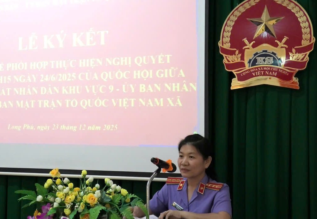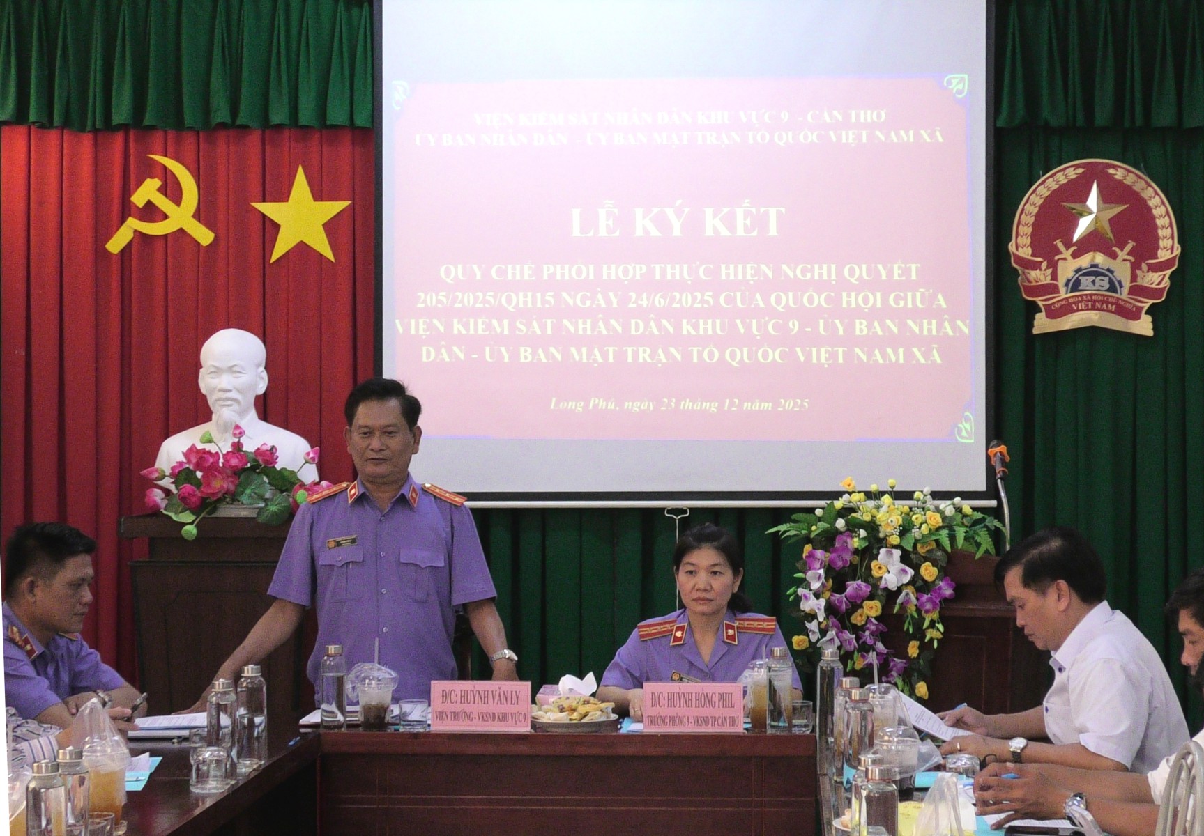 Ngày 23/12/2025, Viện kiểm sát nhân dân (VKSND) Khu vực 9 - Cần Thơ tổ chức Lễ ký kết Quy chế phối hợp thực hiện Nghị quyết 205/2025/QH15 ngày 24/6/2025 của Quốc hội về việc thí điểm Viện kiểm sát nhân dân khởi kiện vụ án dân sự để bảo vệ quyền dân sự của các chủ thể thuộc nhóm dễ bị tổn thương hoặc lợi ích công (Nghị quyết 205/2025/QH15) với Uỷ ban nhân dân và Ủy ban Mặt trận Tổ quốc Việt Nam 11 xã: Long Phú, Đại Ngãi, Trường Khánh, Tân Thạnh, Cù Lao Dung, An Thạnh, Trần Đề, Lịch Hội Thượng, Liêu Tú, Tài Văn, Thạnh Thới An.