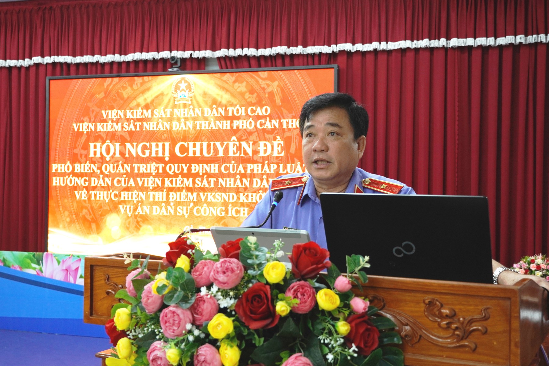 Đ/c Nguyễn Thanh Liêm, Bí thư Đảng uỷ, Viện trưởng VKSND thành phố Cần Thơ phát biểu tại Hội nghị chuyên đề phổ biến, quán triệt các quy định của pháp luật và hướng dẫn của VKSND tối cao về thực hiện thí điểm VKSND khởi kiện vụ án dân sự công ích ngày 29/01/2026